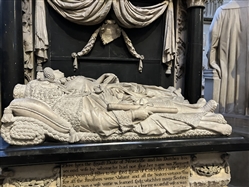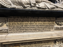 In latin: Here lies that renowned hero, William Cavendish, Knight of the Bath, and Baron Ogle, in right of his mother, Viscount Mansfield, and Baron Cavendish of Bolsover, Earl of Ogle, Earl, Marquess and Duke of Newcastle upon Tyne, Lord Lieutenant of the Counties of Nottingham and Northumberland, first Lord of the Bedchamber to the King, Guardian to Prince Charles, Privy Counsellor to the King, and Knight of the most Noble Order of the Garter. A nobleman, who showing abundant fidelity and courage to the King's Majesty, at the beginning of the Grand Rebellion, was deservedly made Captain General of the Forces raised in the north of the Kingdom. In several battles (which he soon won) and in defending the City of York against the Scots, he gave proofs in all respects of his integrity and unshaken courage; for which reason, when the Rebellion grew strong (being one of the first destined for death), he left his home, and with great resolution endured a long exile. He first married Elizabeth, only daughter and heir of William Bassett of Blore in the County of Stafford, Esquire; who bore him sons, Charles who died without issue, and Henry, heir of the Honours; Daughters Jane, married to Charles Cheney of Chesham-Bois; Elizabeth to John Earl of Bridgwater, and Frances to Oliver Earl of Bolingbroke. He died the 25th of December in the year of Redemption 1676, and of his age the 84th.