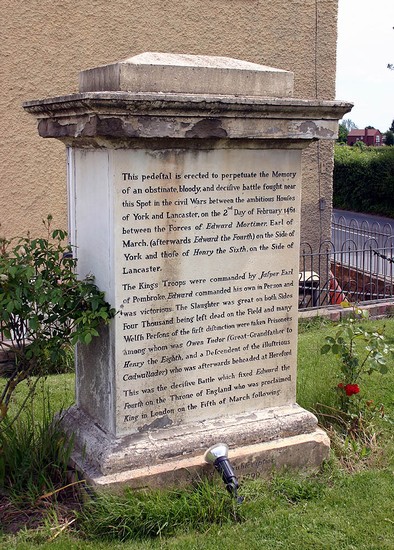 The battle of Mortimer’s Cross was fought on 3 February 1461 when the Yorkist army of Edward, Earl of March, intercepted and defeated a Lancastrian force under Jasper Tudor, Earl of Pembroke, that was marching into England from South Wales. Several of the defeated Lancastrian commanders were captured and later executed in Hereford.