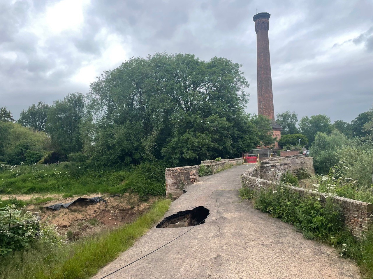 Following the collapse of one of the wing walls of Old Powick Bridge due to a build–up of debris following heavy rains over the winter, a hole has recently appeared in the carriageway of the bridge.