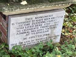 This monument is thought to have been erected by the Dudding family who lived here 1797-1812 to celebrate their cousin Admiral Nelson's victory at Trafalgar. Re-erected 1999. That the Earl of Warwick died here after the Battle of Barnet in 1471 is probably a myth.